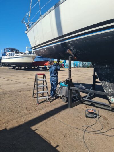 Nadat je boot veilig is aangekomen op de kant, is het tijd om de boot met een hogedrukspuit schoon te maken. Inspecteer vervolgens je bestaande antifouling. Kijk waar je veel slijtage hebt, dat is belangrijk voor de volgende stappen. Ook is het belangrijk om te controleren of je ergens blaasjes kan vinden. Je hebt gewonnen als je die niet hebt kunnen vinden.