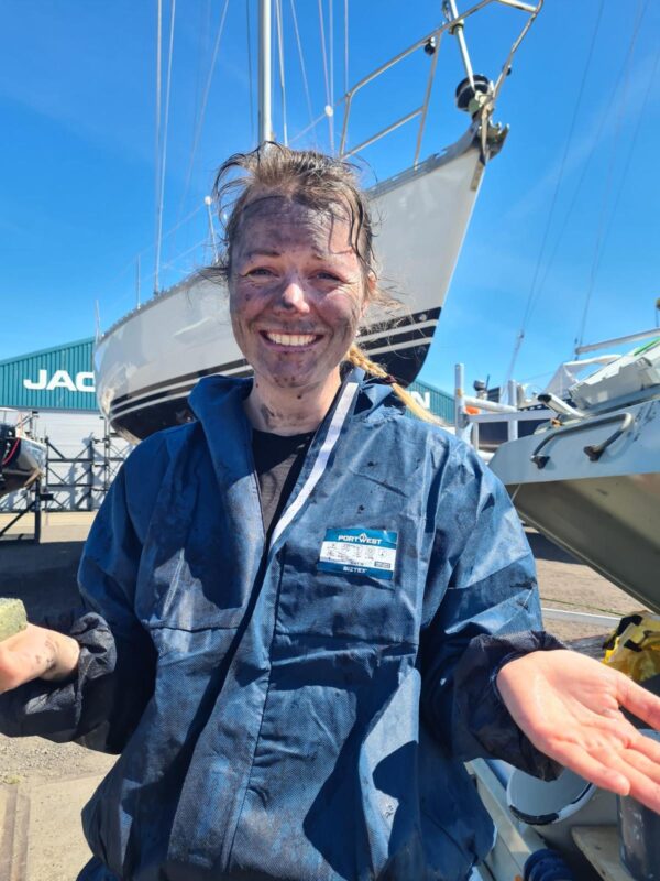 Antifouling is giftig spul en daarom is het belangrijk om jezelf en je omgeving te beschermen. Zorg dat je handschoenen, een overall met muts, een veiligheidsbril en een mondkapje draagt. Trek dit niet alleen aan tijdens het aanbrengen van de antifouling, maar ook tijdens het schuren! Zoals je op de foto ziet was ik eigenwijs en had ik mezelf niet goed beschermd tijdens het schuren. Ik heb dagen lang met zwarte vegen op mijn armen en met zere ogen rondgelopen.